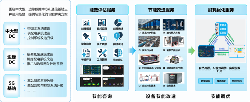 围绕中大型中心、边缘中心、5G基站三种场景,以“平台+服务”,为客户给予数据中心节能咨询、节能改造、能耗优化等节能优化服务。