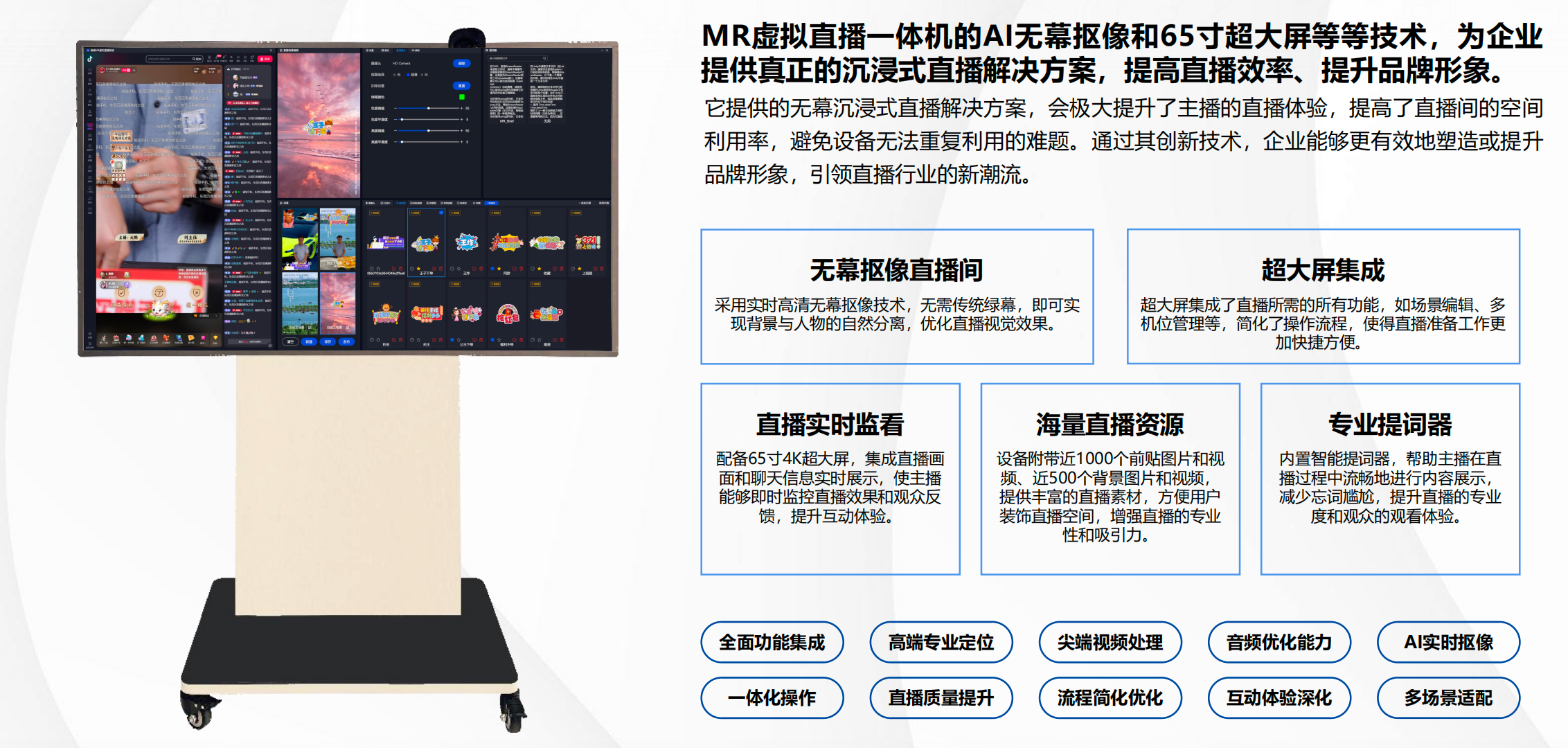 融合了导播、提词、直播间编辑等全面功能,定位于高端专业直播设备市场。该设备采用了尖端的视频处理技术、音频优化能力及AI视频实时抠像技术,旨在顺利获得一体化的功能整合和专业化设计,全面优化直播质量、简化直播操作流程并深化互动体验。它的推出明显提升了直播内容的制作水平,从而满足了不同领域从企业级到个人级用户的专业直播需求。适配于多样化的直播场景, ■澳门十大棋牌排行榜最新■虚拟直播一体机已成为提升直播效果、增强观众互动和优化直播体验的首选解决方案。